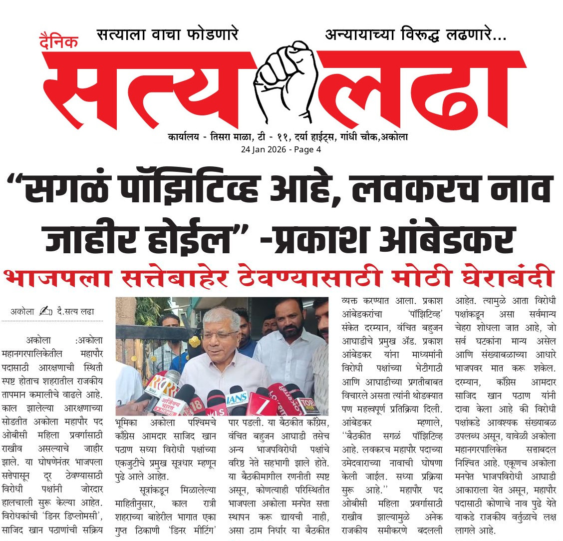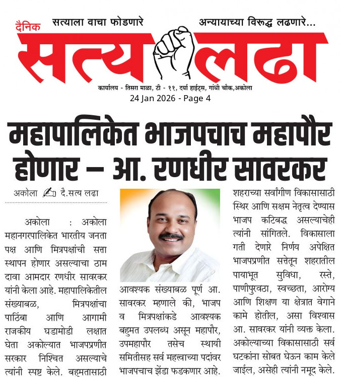 AKOLA NEWS महापालिकेत भाजपचाच महापौर होणार – आ. रणधीर सावरकर admin January 23, 2026 Share this: Share on Facebook (Opens in new window) Facebook Share on X (Opens in new window) X WhatsApp Facebook Twitter Like this:Like Loading... Post navigation Previous: अकोला महानगरपालिके राजकीय भूकंप होणार सर्व पक्ष एकत्र येणार तर भाजपला सत्ताबाहेर ठेवणार?Next: अकोला महानगरपालिकेत सत्ताबदल: ‘शहर सुधार आघाडी’कडे बहुमत, 44 नगरसेवकांचा पाठिंबा Leave a Reply Cancel replyYour email address will not be published. Required fields are marked *Comment * Name * Email * Website Save my name, email, and website in this browser for the next time I comment.