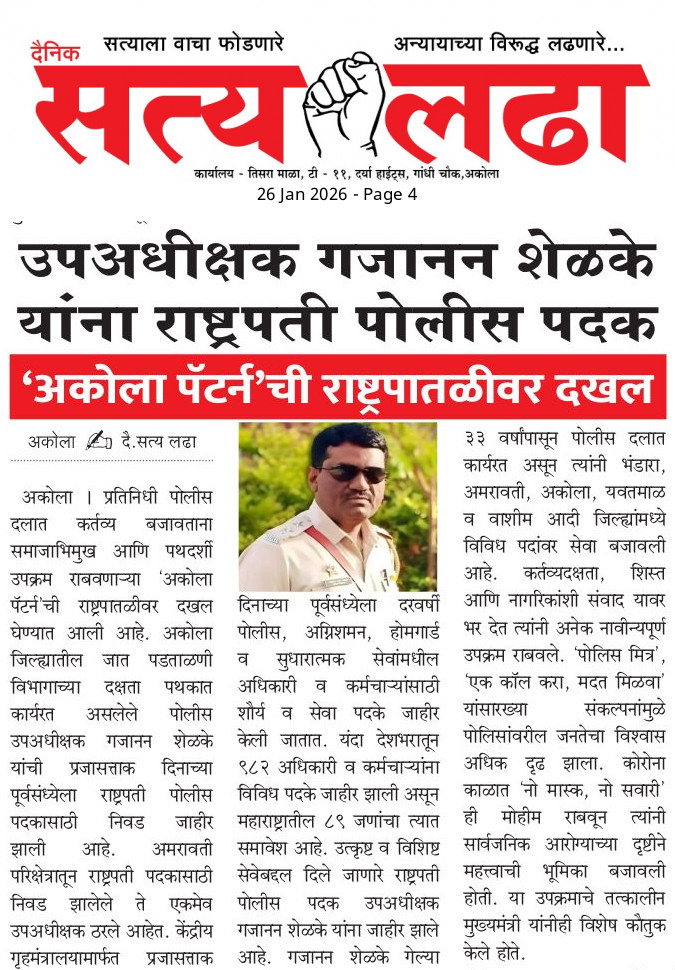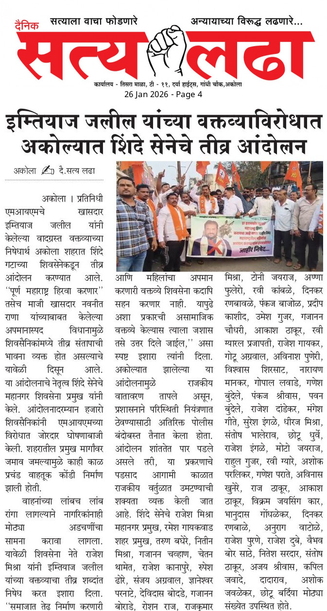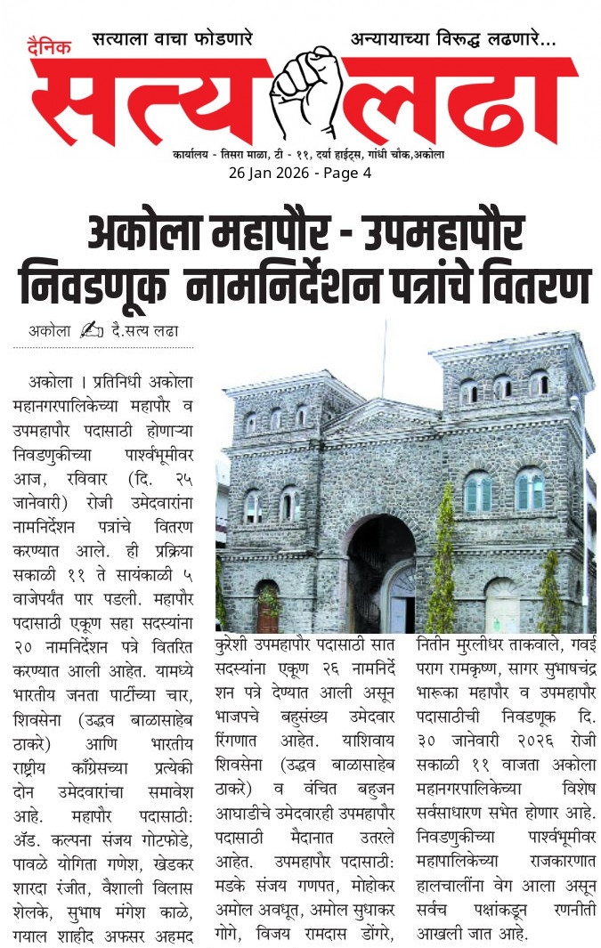 AKOLA NEWS अकोला महापौर – उपमहापौर निवडणूक नामनिर्देशन पत्रांचे वितरण admin January 25, 2026 1 minute read WhatsApp Facebook Twitter Post navigation Previous: सत्तेसाठी तडजोडीचे राजकारण; भाजपाला जि.प.नि.. धोका ?Next: अकोला महापौर निवडणूक: शारदा खेडकर आणि अमोल गोगे यांचे नामांकन दाखल 1 thought on “अकोला महापौर – उपमहापौर निवडणूक नामनिर्देशन पत्रांचे वितरण” जिहादी लुटारू औरंग्याला महाराष्ट्र हिरवा करता आला नाही मग ही त्याची पिलावळ काय चीज आहे शिवाय राजकीय बयांनबाजी करण्यापलीकडे ! Reply Leave a Reply Cancel replyYour email address will not be published. Required fields are marked *Comment * Name * Email * Website Save my name, email, and website in this browser for the next time I comment.