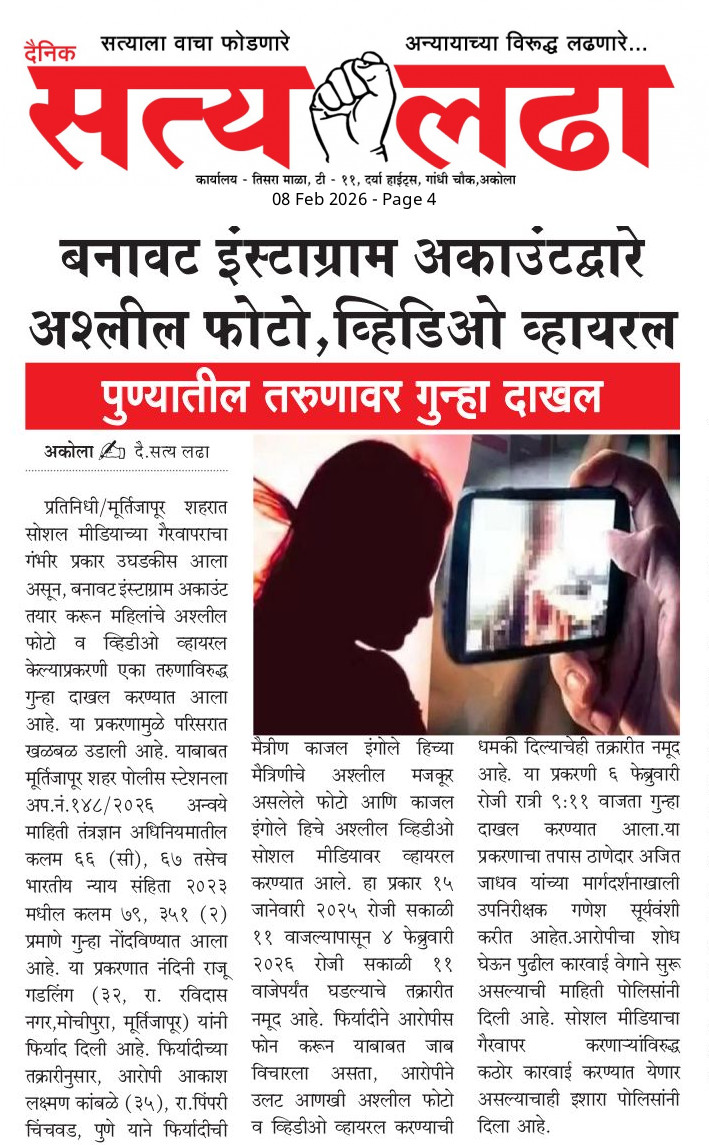 AKOLA NEWS बनावट इंस्टाग्राम अकाउंटद्वारे अश्लील फोटो, व्हिडिओ व्हायरल admin February 8, 2026 WhatsApp Facebook Twitter Post navigation Previous: ट्रक अपघातात चालक व क्लीनरचा दुर्दैवी मृत्यूNext: अकोला पोलीसांची खुल्या जागेत दारू पिणाऱ्या ४४ इसमांविरुध्द कारवाई Leave a Reply Cancel replyYour email address will not be published. Required fields are marked *Comment * Name * Email * Website Save my name, email, and website in this browser for the next time I comment.
