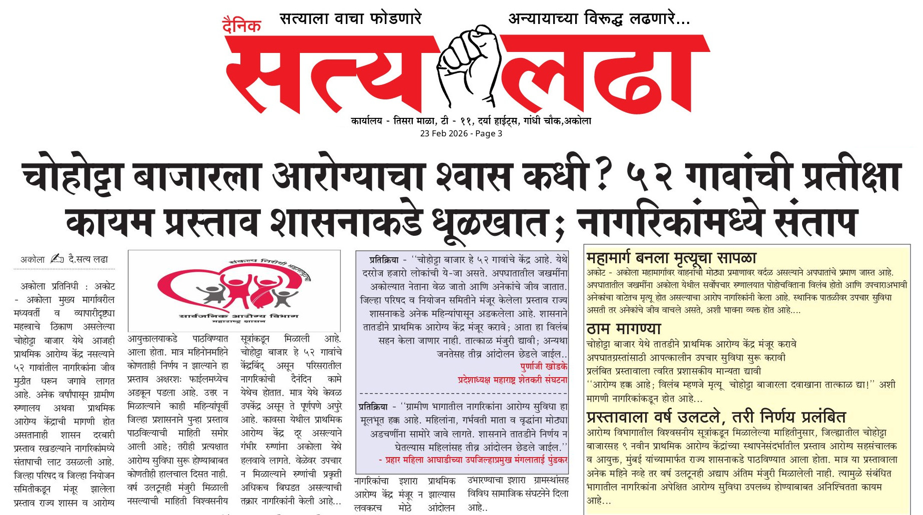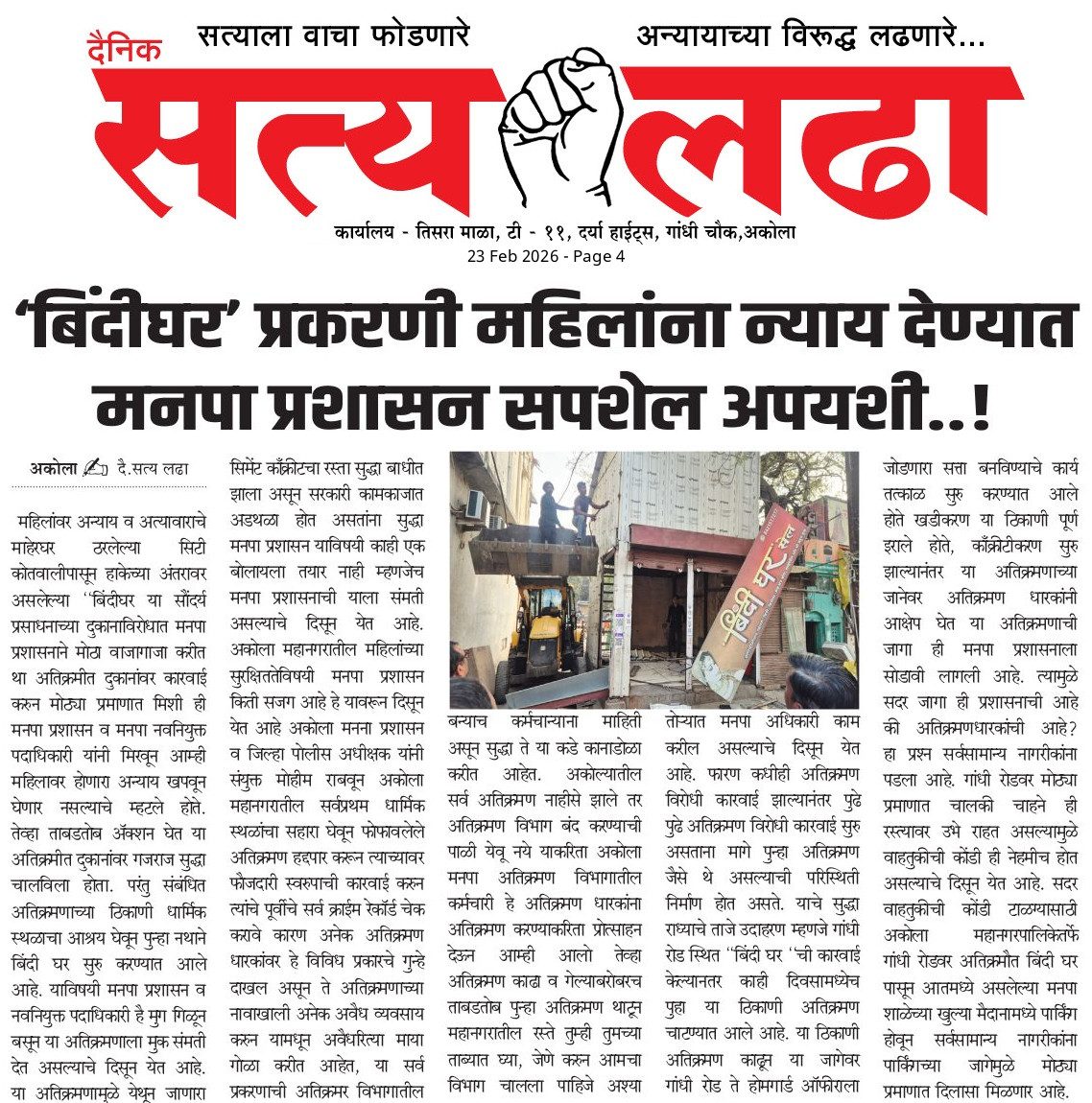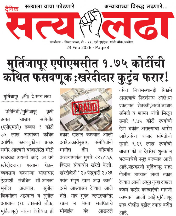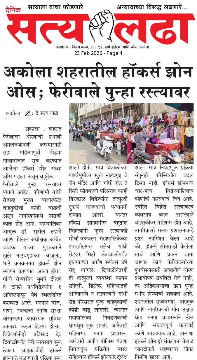 AKOLA NEWS ‘बिंदीघर’ प्रकरणी महिलांना न्याय देण्यात मनपा प्रशासन सपशेल अपयशी..! admin February 22, 2026 Share this: Share on Facebook (Opens in new window) Facebook Share on X (Opens in new window) X WhatsApp Facebook Twitter Like this:Like Loading... Post navigation Previous: रील बनवण्याचा बहाणा अन् तब्बल 21 लाखांचा ऐवज लंपासNext: अकोला महापालिकेत आढावा बैठकः महापौरची फक्त उपस्थिती ? Leave a Reply Cancel replyYour email address will not be published. Required fields are marked *Comment * Name * Email * Website Save my name, email, and website in this browser for the next time I comment.