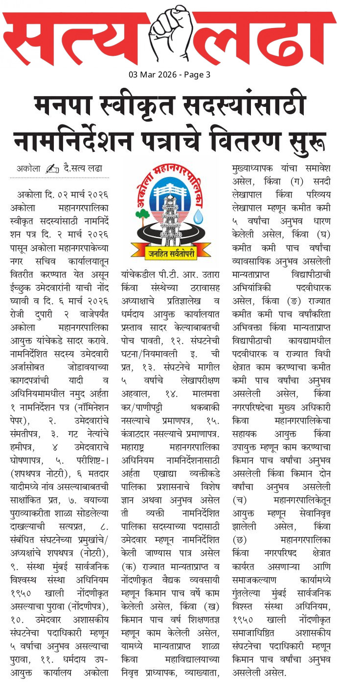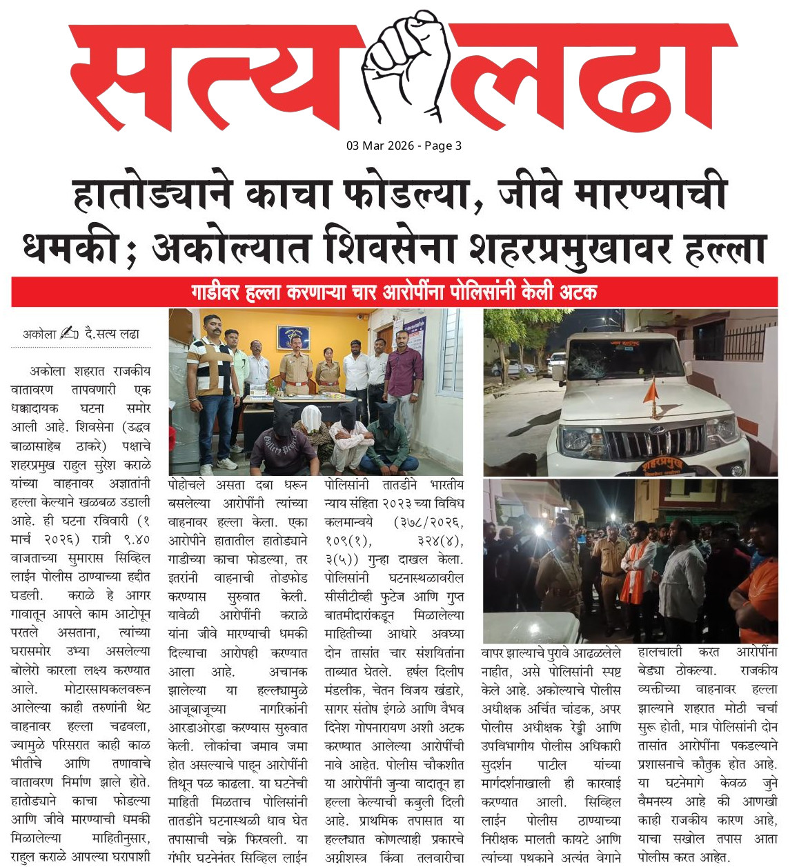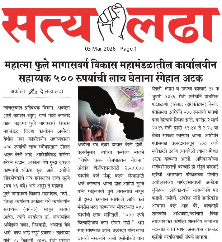 AKOLA NEWS महात्मा फुले मागासवर्ग विकास महामंडळातील कार्यालयीन सहाय्यक ५०० रुपयांची लाच घेताना रंगेहात अटक admin March 2, 2026 Share this: Share on Facebook (Opens in new window) Facebook Share on X (Opens in new window) X WhatsApp Facebook Twitter Like this:Like Loading... Post navigation Previous: अकोल्यात खळबळ: शिवसेना शहर प्रमुख राहुल कराले यांच्या वाहनाची तोडफोडNext: अकोल्यात रंगपंचमीला भीषण अपघाताचे गालबोट; सुसाट वाहनाने दोघांना चिरडले Leave a Reply Cancel replyYour email address will not be published. Required fields are marked *Comment * Name * Email * Website Save my name, email, and website in this browser for the next time I comment.