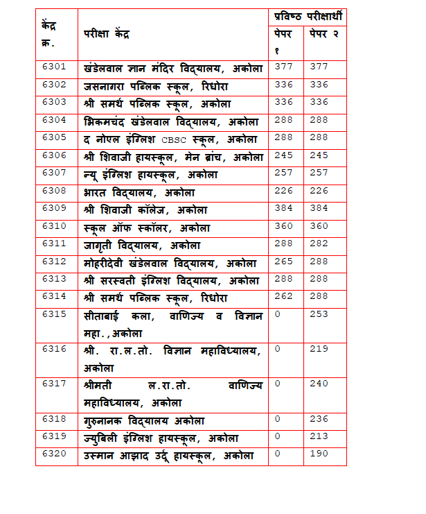 अकोला जिल्हा अंतर्गत एकूण २० परीक्षा केंद्र व प्रविष्ठ परीक्षार्थी यांची यादी खालीलप्रमाणे आहे.