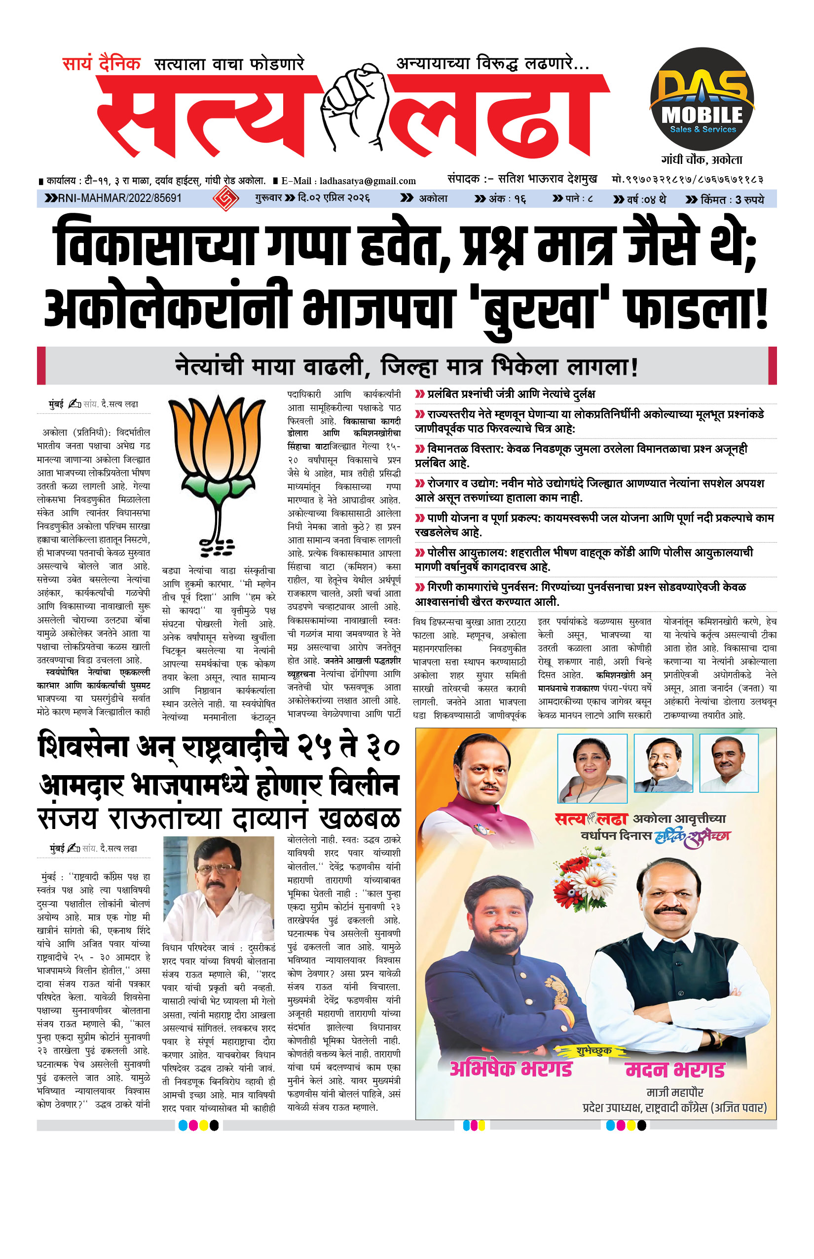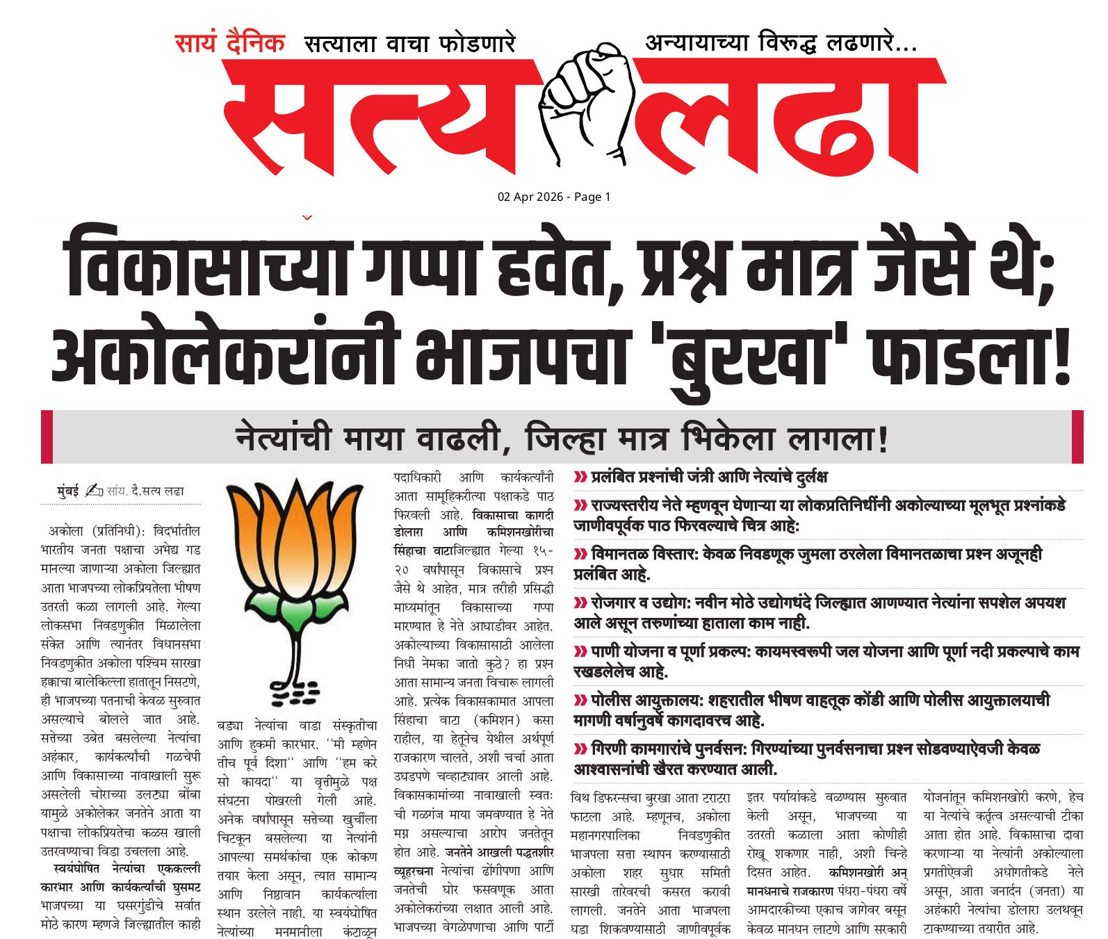 AKOLA NEWS विकासाच्या गप्पा हवेत, प्रश्न मात्र जैसे थे; अकोलेकरांनी भाजपचा ‘बुरखा’ फाडला! admin April 2, 2026 WhatsApp Facebook Twitter Post navigation Previous: रक्षणकर्तेच बनले भक्षक; सिव्हिल लाईन पोलीस ठाण्यातील घृणास्पद प्रकाराने खळबळ Leave a Reply Cancel replyYour email address will not be published. Required fields are marked *Comment * Name * Email * Website Save my name, email, and website in this browser for the next time I comment.