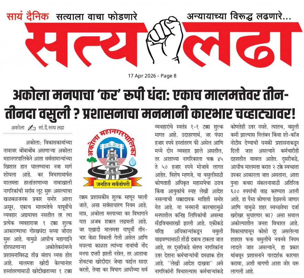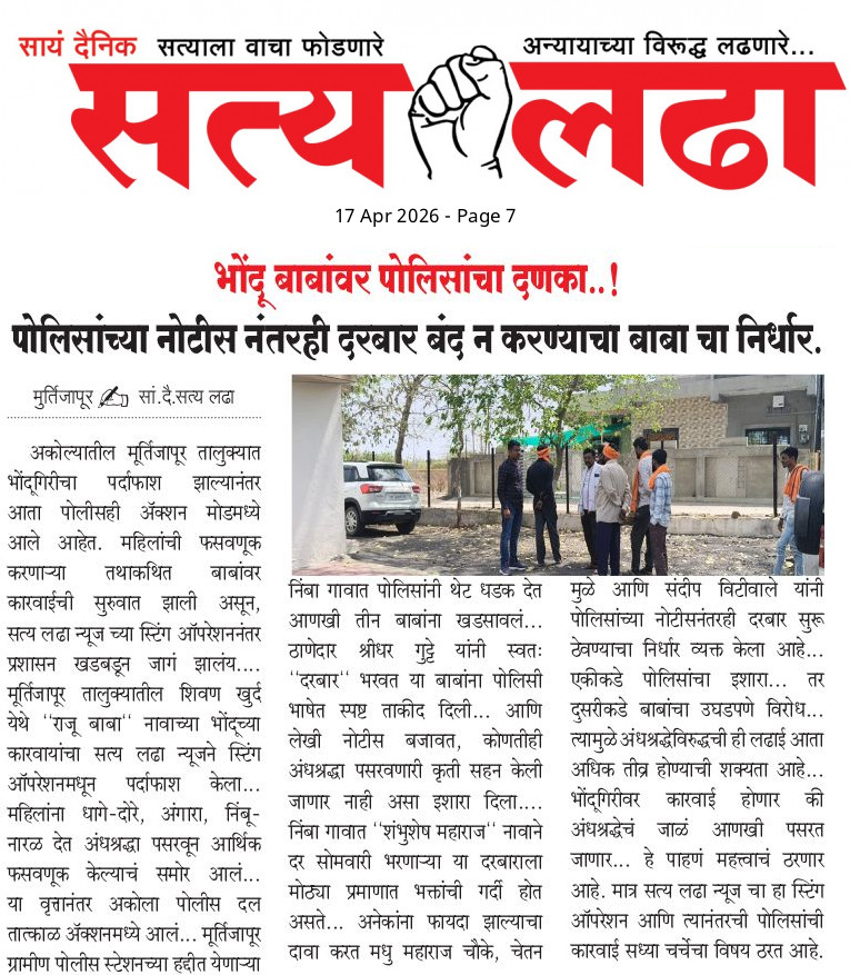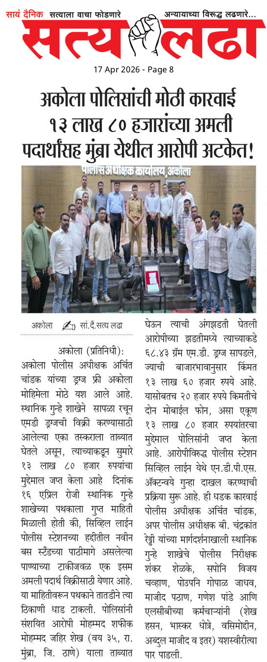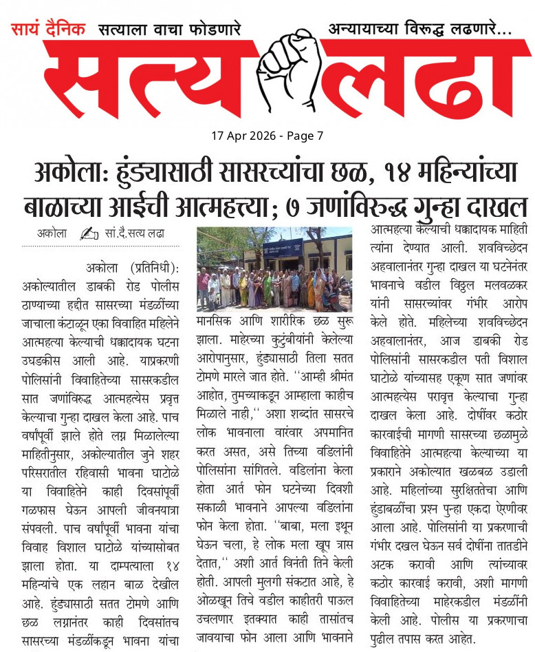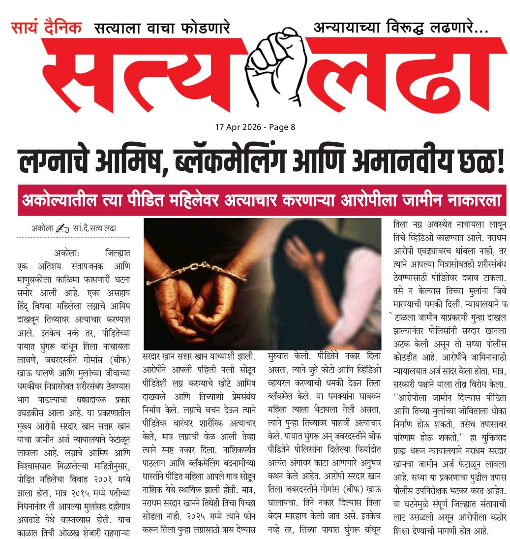 AKOLA NEWS लग्नाचे आमिष, ब्लॅकमेलिंग आणि अमानवीय छळ ! admin April 17, 2026 Share this: Share on Facebook (Opens in new window) Facebook Share on X (Opens in new window) X WhatsApp Facebook Twitter Like this:Like Loading... Post navigation Previous: अकोला मनपात ‘महायुती’त रणकंदन ! बॅनर फाडल्यावरून शिवसेना (शिदे गट) आक्रमक Leave a Reply Cancel replyYour email address will not be published. Required fields are marked *Comment * Name * Email * Website Save my name, email, and website in this browser for the next time I comment.