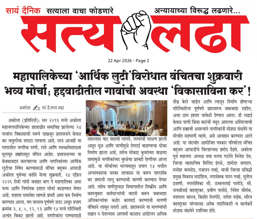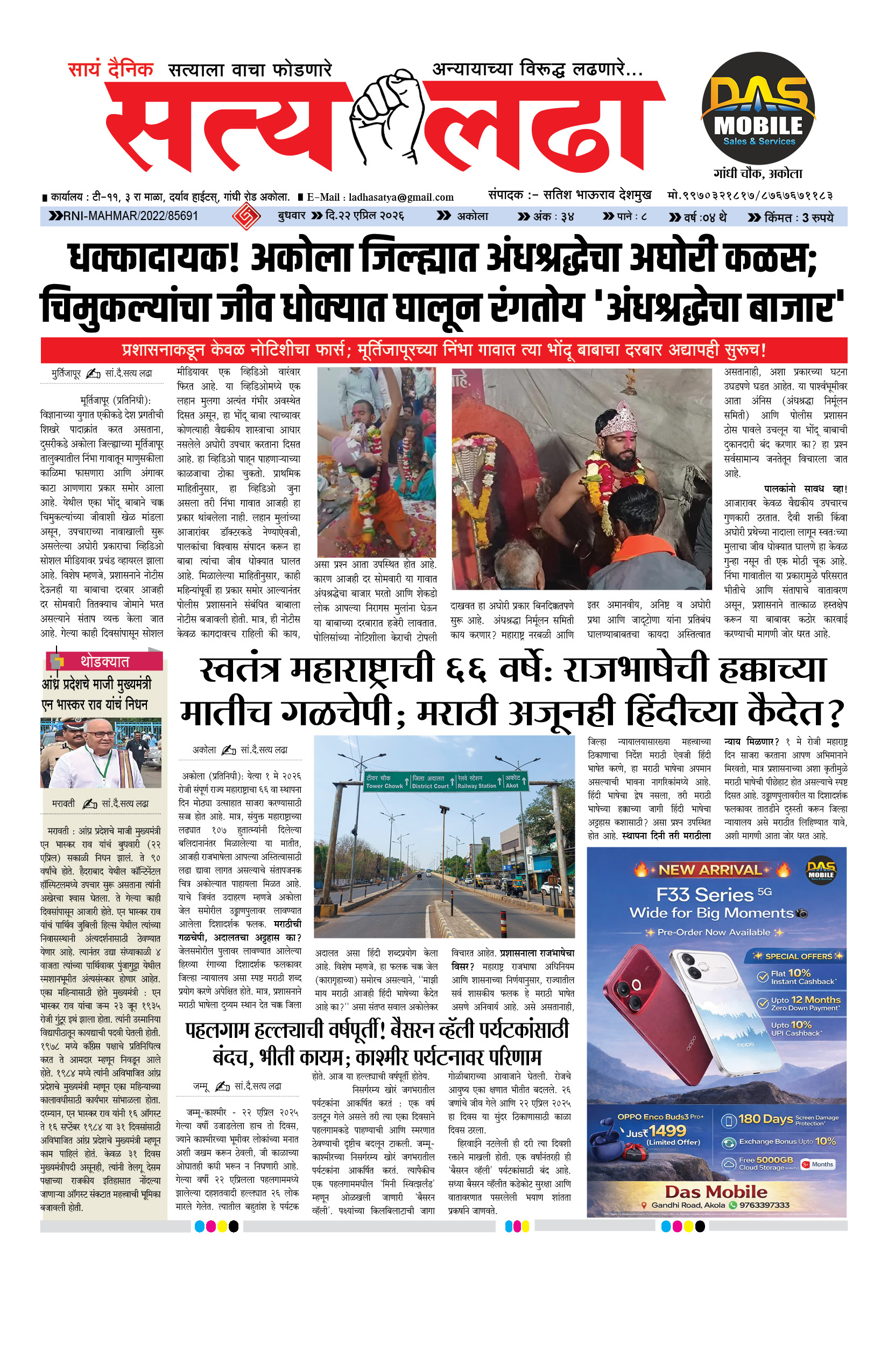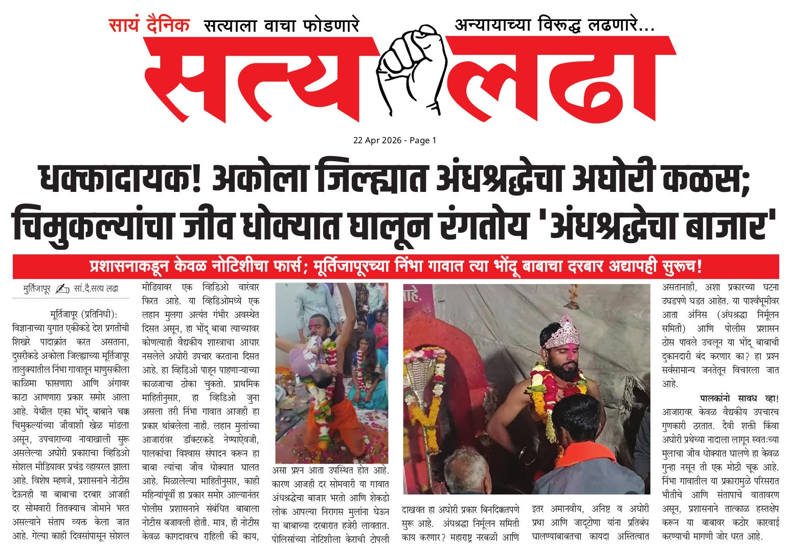 AKOLA NEWS धक्कादायक! अकोला जिल्ह्यात अंधश्रद्धेचा अघोरी कळस; चिमुकल्यांचा जीव धोक्यात घालून रंगतोय ‘अंधश्रद्धेचा बाजार’ admin April 22, 2026 Share this: Share on Facebook (Opens in new window) Facebook Share on X (Opens in new window) X WhatsApp Facebook Twitter Like this:Like Loading... Post navigation Previous: भ्रष्टाचाराच्या आरोपांचे काळे सावट असताना ‘परमनंट’ होण्याचा घाट; वादग्रस्त उपअभियंता वाडेकर यांचे निलंबन कधी ? Leave a Reply Cancel replyYour email address will not be published. Required fields are marked *Comment * Name * Email * Website Save my name, email, and website in this browser for the next time I comment.
