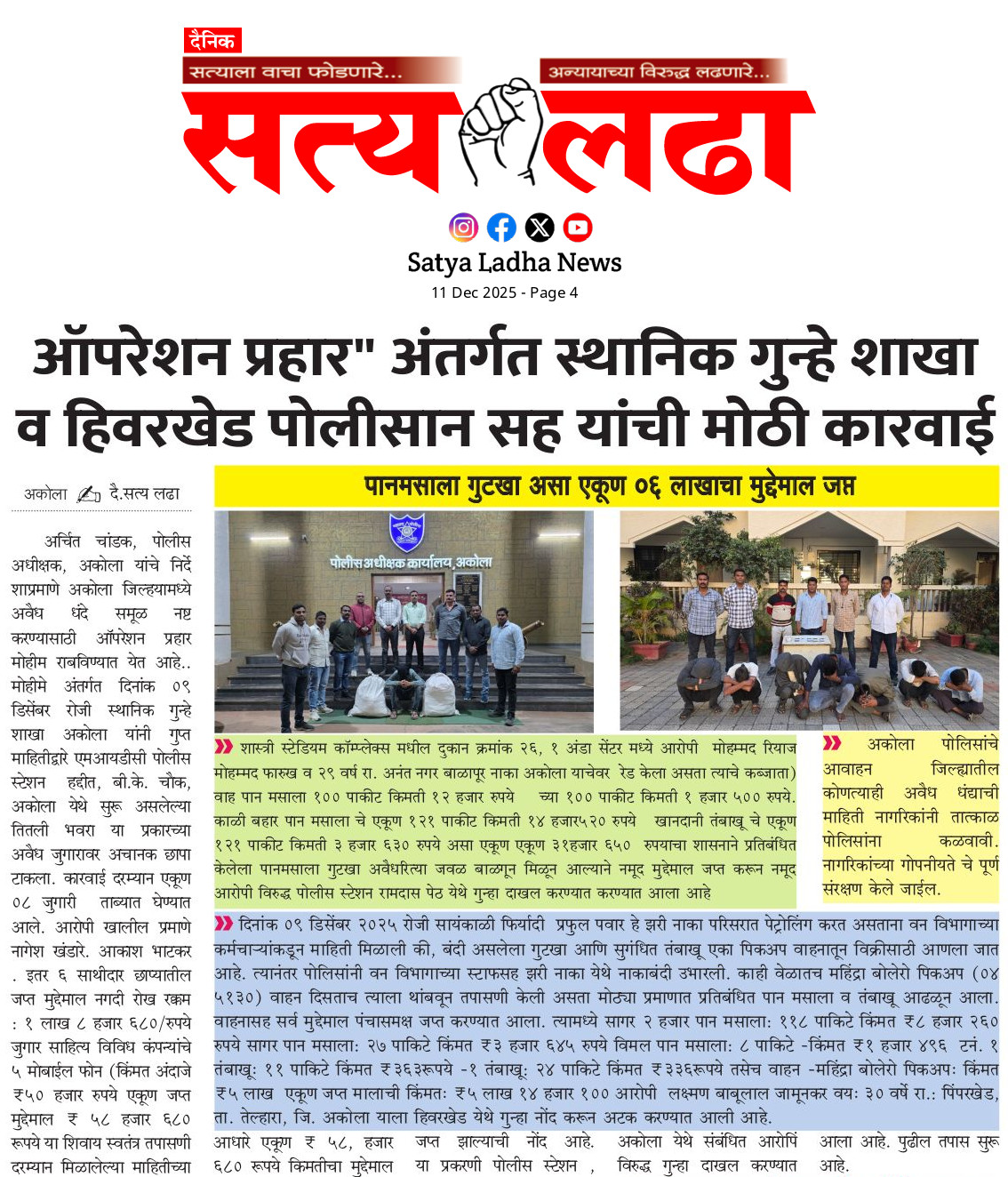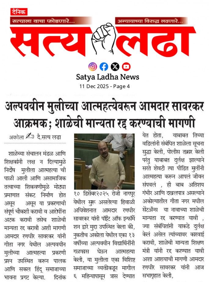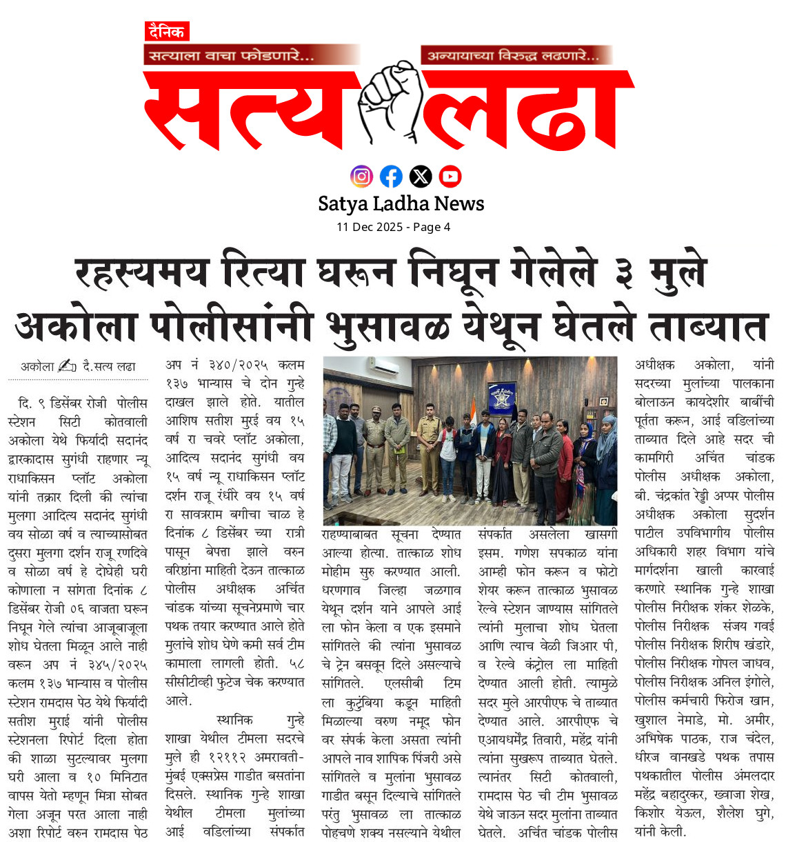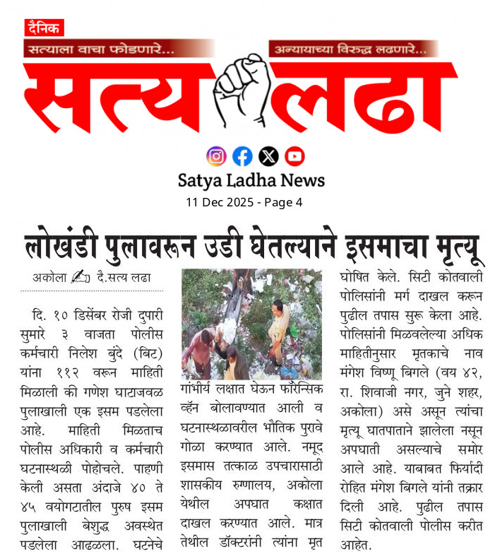 AKOLA NEWS रहस्यमय रित्या घरून निघून गेलेले ३ मुले अकोला पोलीसांनी भुसावळ येथून घेतले ताब्यात admin December 10, 2025 Share this: Share on Facebook (Opens in new window) Facebook Share on X (Opens in new window) X WhatsApp Facebook Twitter Like this:Like Loading... Post navigation Previous: लोखंडी पुलाखाली अज्ञात व्यक्तीचा मृतदेह; परिसरात खळबळNext: नायलॉन मांजा विकणाऱ्या दोन आरोपींना अटक Leave a Reply Cancel replyYour email address will not be published. Required fields are marked *Comment * Name * Email * Website Save my name, email, and website in this browser for the next time I comment.