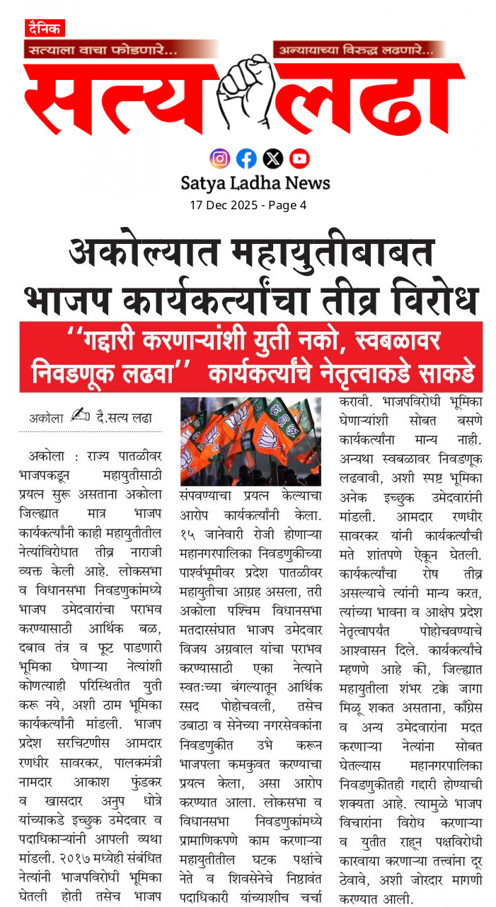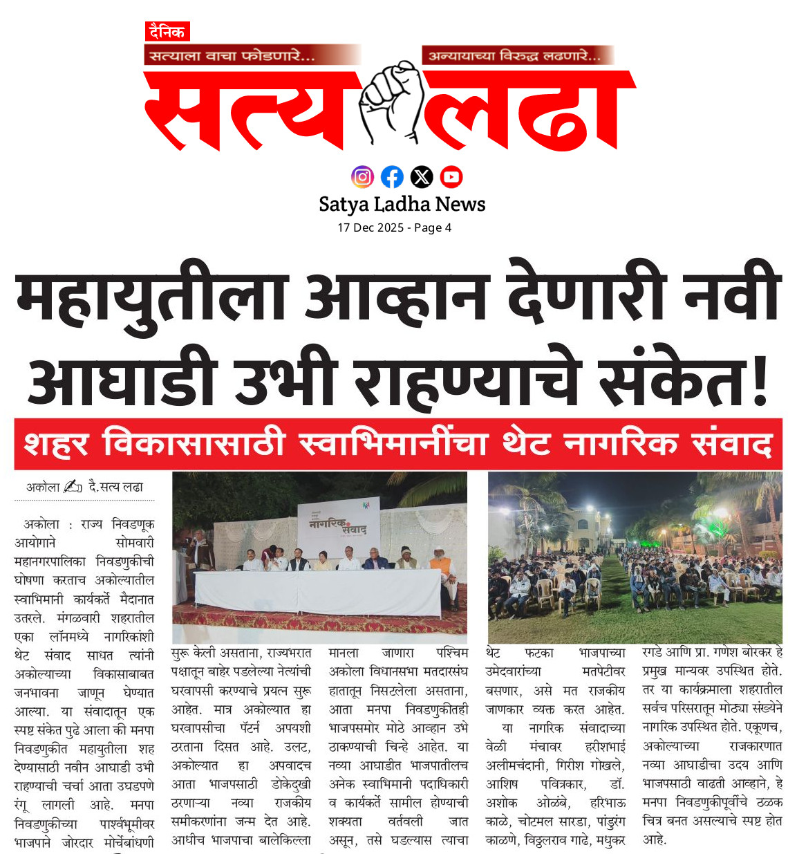 AKOLA NEWS महायुतीला आव्हान देणारी नवी आघाडी उभी राहण्याचे संकेत ! admin December 16, 2025 Share this: Share on Facebook (Opens in new window) Facebook Share on X (Opens in new window) X WhatsApp Facebook Twitter Like this:Like Loading... Post navigation Previous: सदनिका घोटाळाप्रकरणी क्रीडामंत्री माणिकराव कोकाटेंना 2 वर्षांची शिक्षाNext: अकोला जिल्हा परिषदेत एसीबीचा ट्रॅप Leave a Reply Cancel replyYour email address will not be published. Required fields are marked *Comment * Name * Email * Website Save my name, email, and website in this browser for the next time I comment.